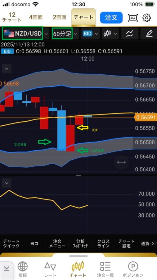 11時に投資、12時に追加投資、13時24分に決済。
