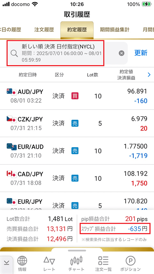 8月の画像と大きく異なる点として、スワップ損益合計がー635円になっています。