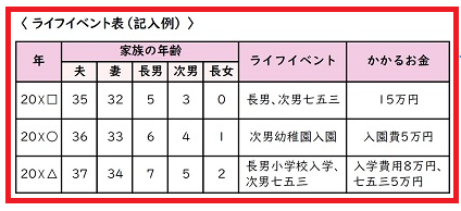 ライフイベント表は、現在の家族年齢から何年後にどのようなライフイベントがあるのか?一目でわかる一覧表になります。