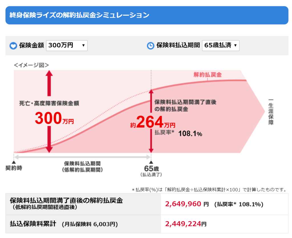 具体的なイメージについて、以下、オリックス生命が販売している「終身保険ライズ」を例として、同社WEBサイトのシミュレーションをしたものを基に解説を進めていきます。