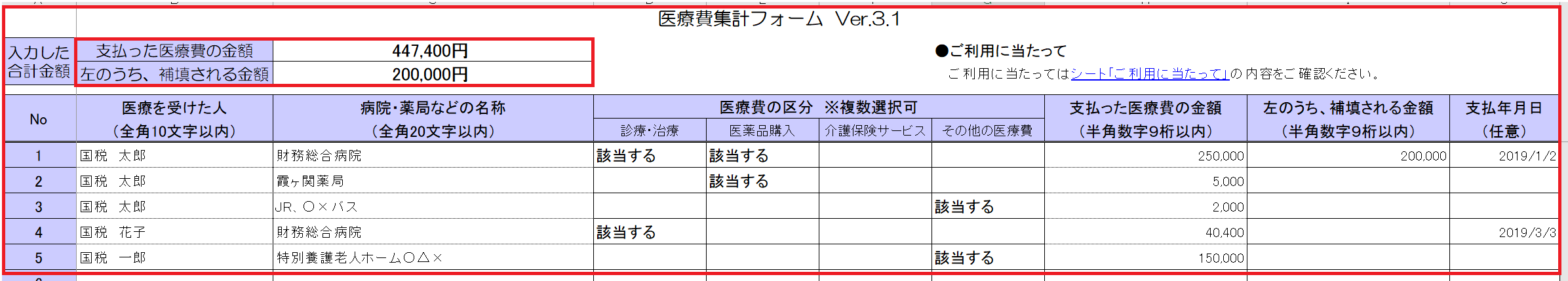 なお、上記イメージの入力例のように、医療費控除の集計フォームに入力した結果は、以下の通りです。